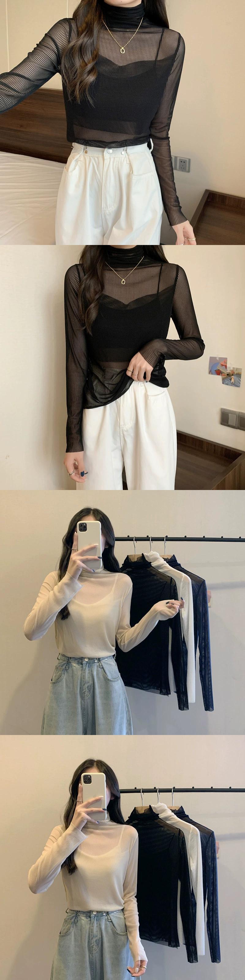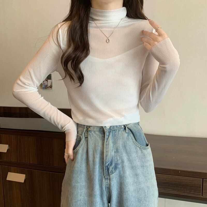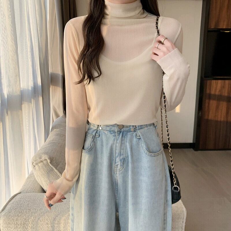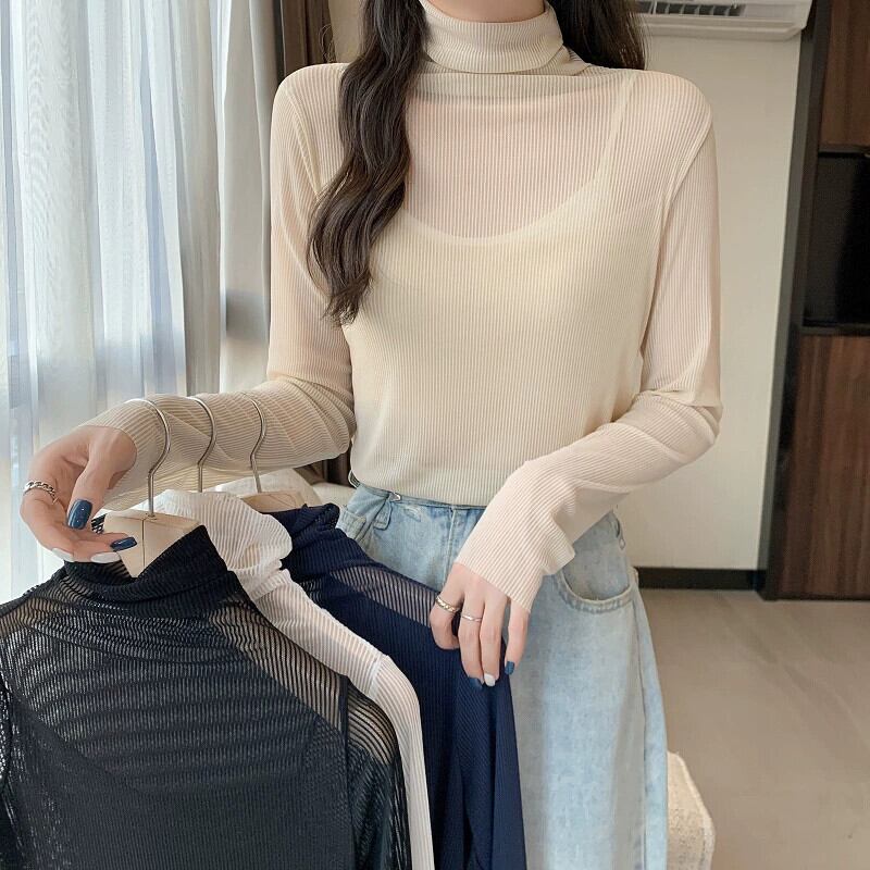 パイルカラーハイカラーレースボトミングシャツ女性秋と冬純粋な欲望セクシーなタイトなメッシュトップ無地長袖 tシャツ女性 ロング オータム 秋物 ウィンター 冬物 ピュア ソリッドカラー kawei39112198374 | cft21